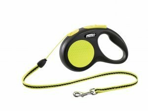 Alle Flexi’s zijn uitgerust met een kortslagremsysteem. Reageert quasi onmiddellijk. Door de remknop in te drukken en een lichte trek te geven, kan je je hond kort bevelen of terug naar jou leiden.