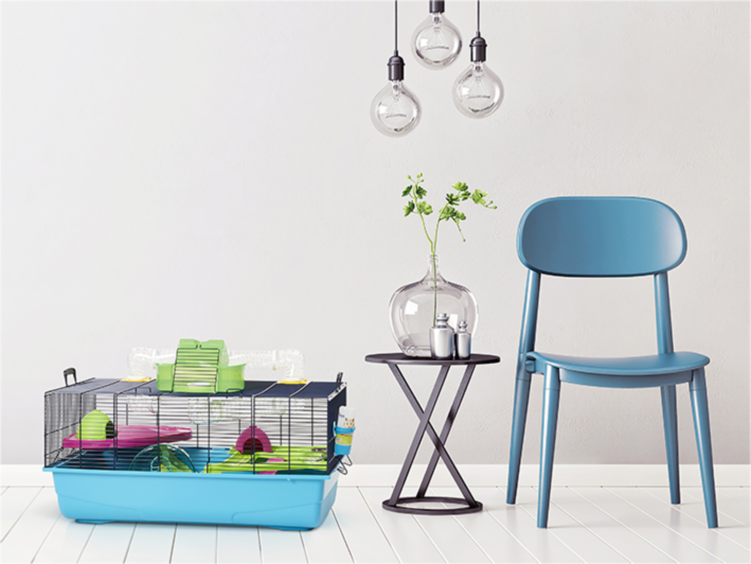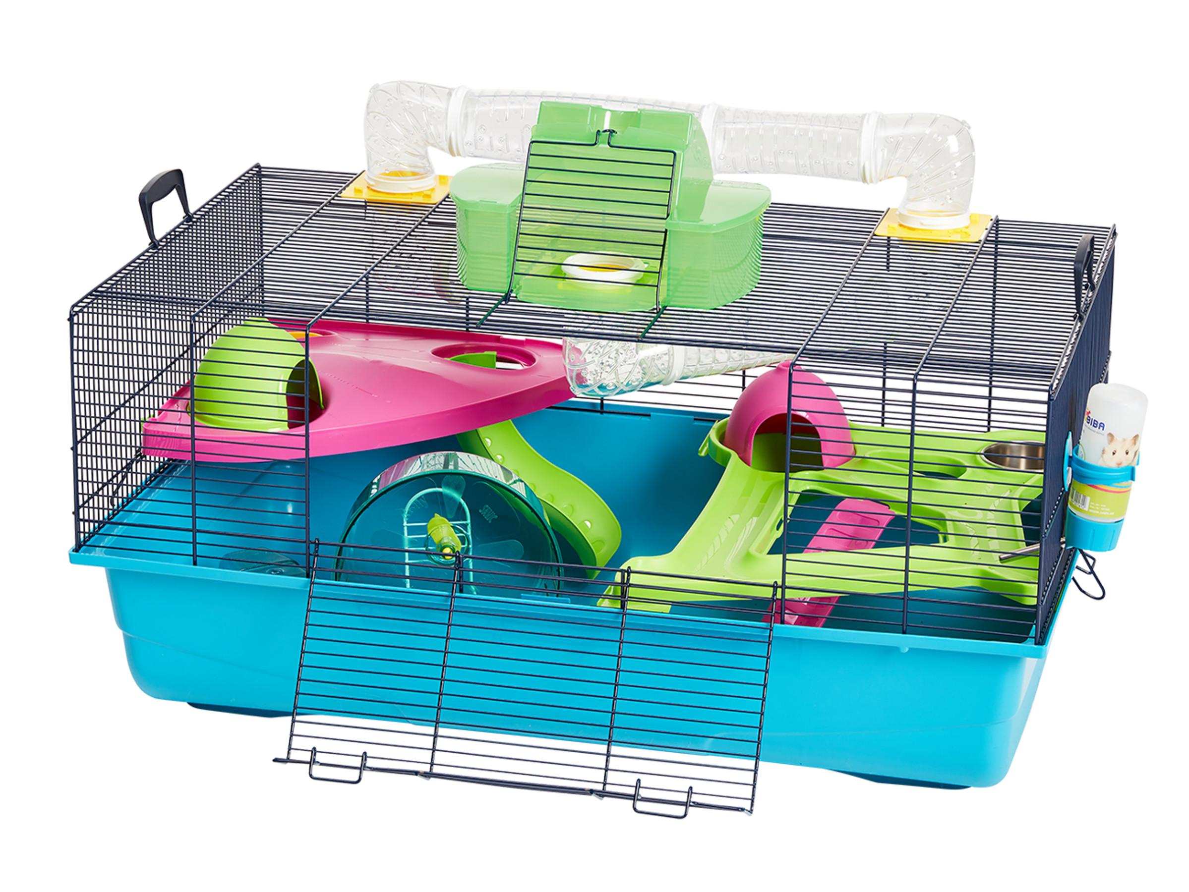 Het grote bodemoppervlak zorgt voor veel speel- en tunnelplezier. De kooi wordt geleverd met twee verhoogde platforms, twee huizen, twee voerbakken, een drinkfles, een loopwiel, een buitentunnel met ventilatiegaten en een hamstertoilet.