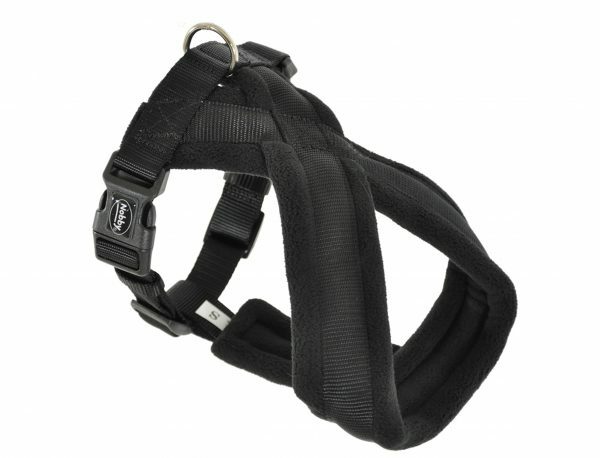 Stevige nylon bestand tegen sterke trekkrachten. Voorzien van een zeer goede binnenafwerking met fleece voor een optimaal comfort.Regelbaar harnas, dat zich perfect aan uw hond aanpast, voorzien van 2 steekgespen.
