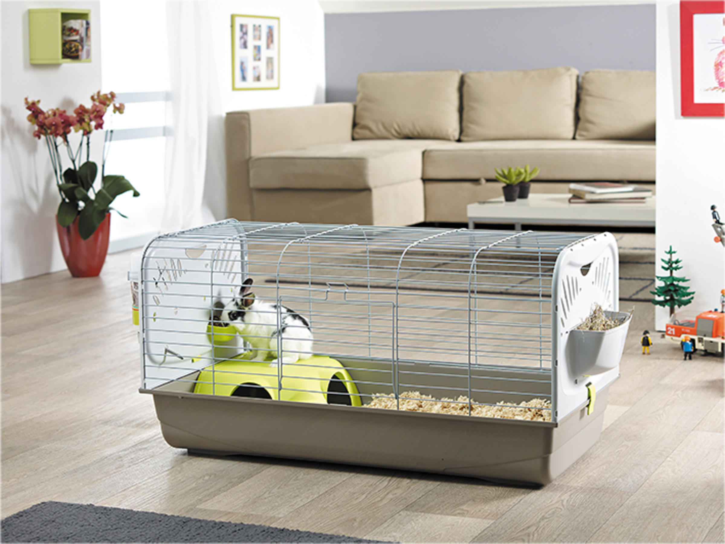 Het ruime huis van binnen heeft twee gaten. Het platform is een heerlijke plek om overdag te zitten en te liggen. De voerbak, de drinkfles, de hooiruif en de handvatten zijn verwerkt in de zijpanelen. De voerbak en de hooiruif vul je van buitenaf bij.
