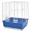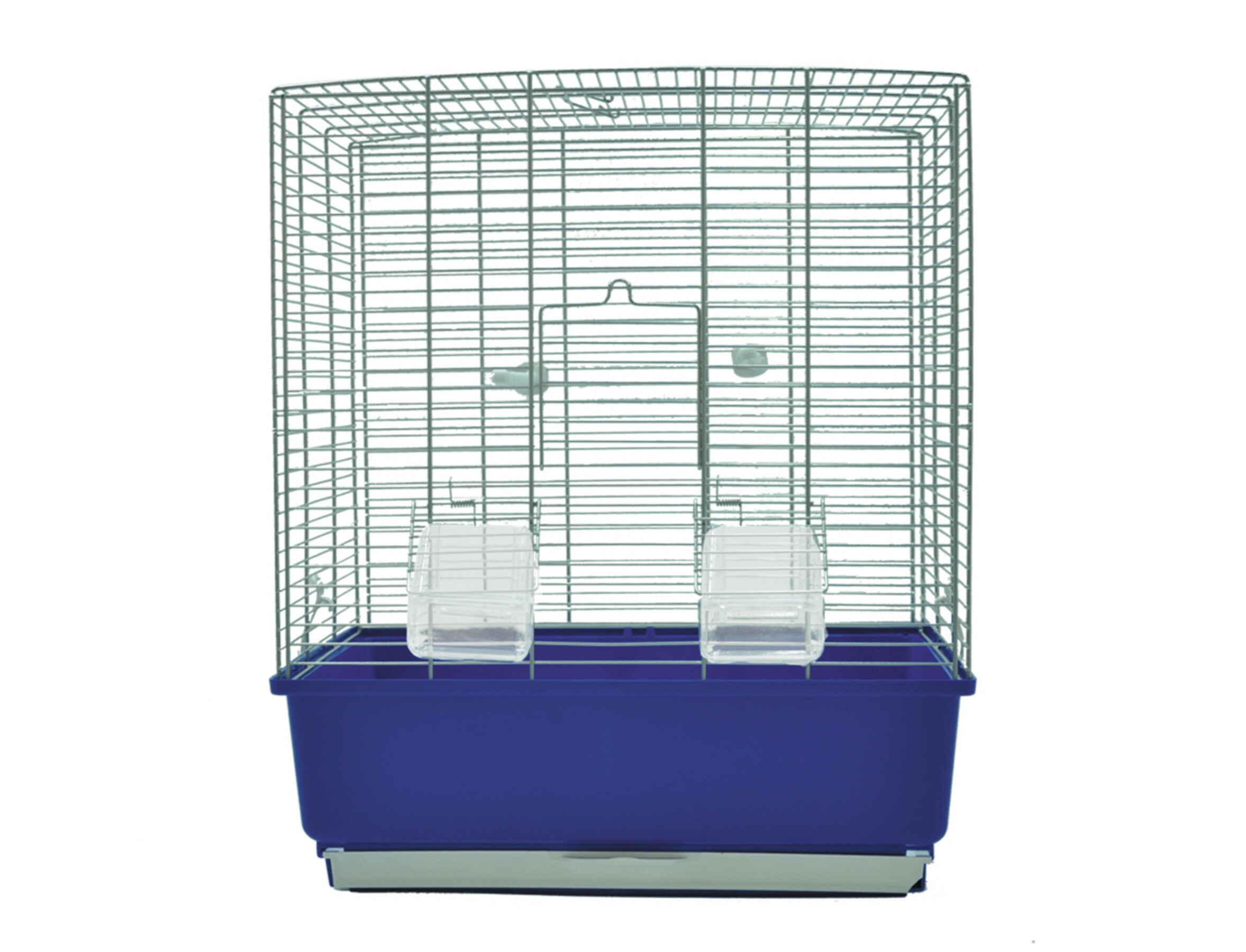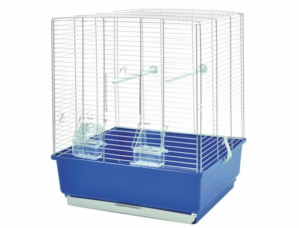 Rechthoekige kooi, verchroomde draad.41 x 31 x 50cmMet schuif voor een gemakkelijke reiniging, met handvat om kooi op te hangen et te transporterenMet blauwe bodem, transparante eetbakjes, zitstokken. Horizontale draad, ideaal voor parkieten.