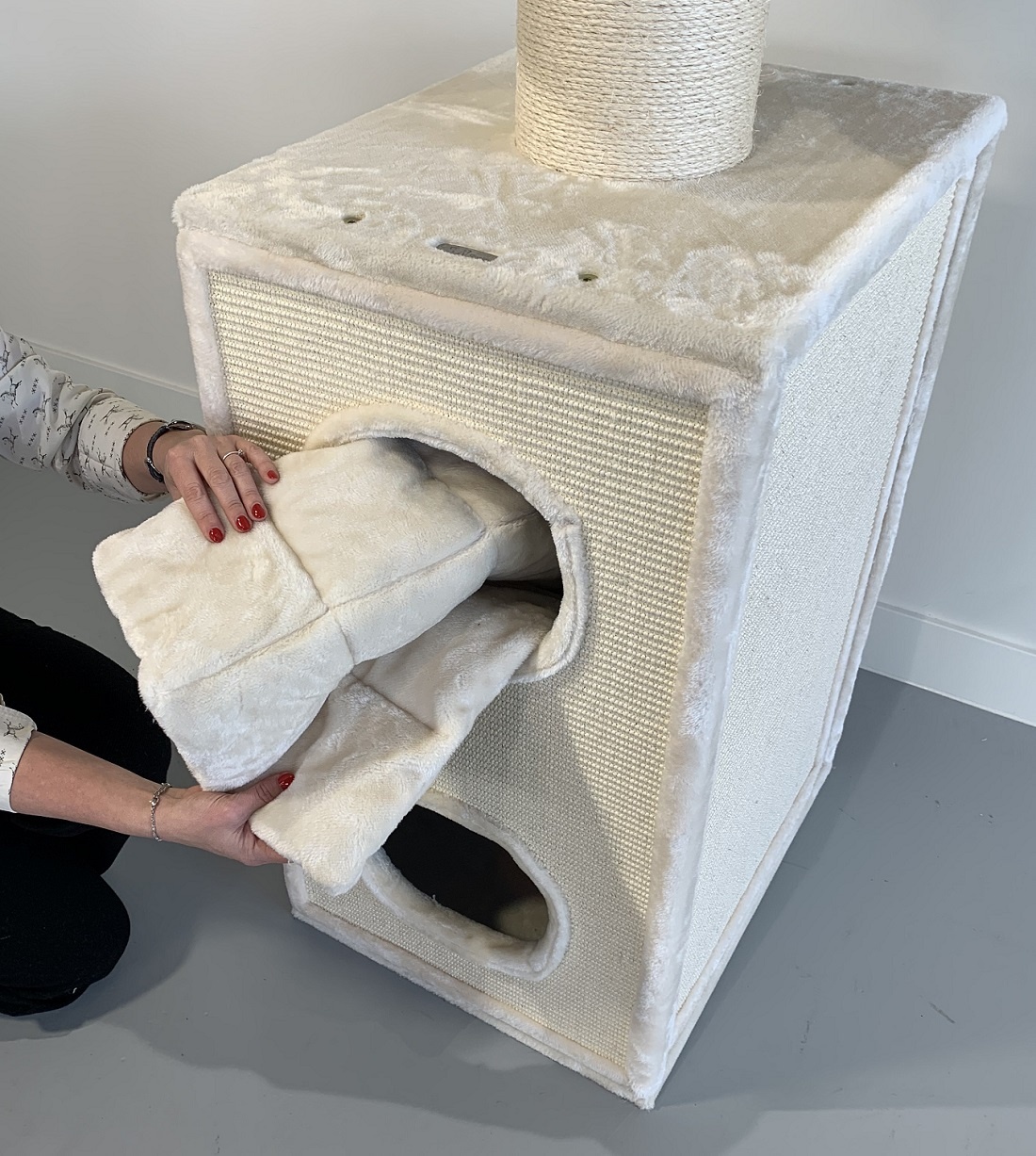 Het speelhuis onderin heeft twee ruime ingangen en is geheel bekleed met sisal waaraan de kat lekker uitgestrekt kan krabben. Hierin ligt een heerlijk zacht doorgestikt kussen dat uitneembaar en wasbaar is. Het draaibare ligplateau is bekleed met fijne zachte pluche.