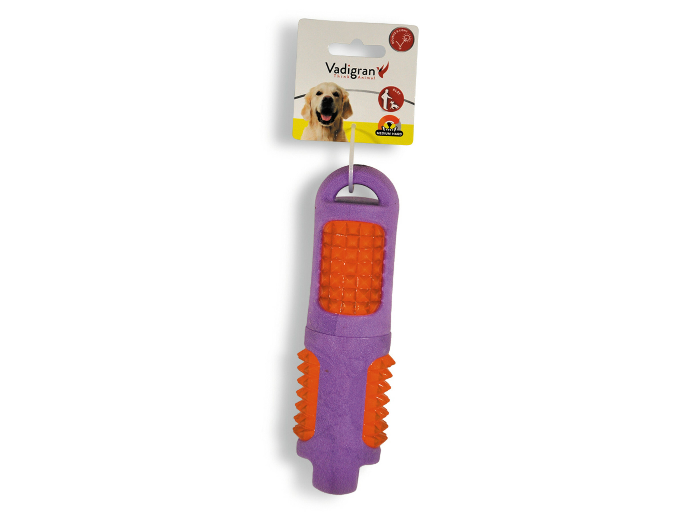 Speeltje vvoor honden in de vorm van een stok. Het is gemaakt van TPR-schuim, zacht materiaal, soepel maar zeer resistent. Dit interactieve speeltje geeft licht: een veelkleurig licht wordt verpreid als het speeltje een hard oppervlak raakt.Het door de bal verspreidde licht trekt de aandacht van het dier en maakt het mogelijk om ook in het donker met het speeltje te spelen.Dit speeltje in de vorm van een stok is ideaal voor de activiteit “weggooien-terugbrengen” omdat het heel goed stuitert.