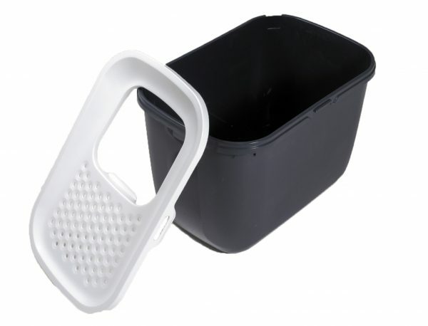 Het deksel is geperforeerd en licht hellend met een anti-slip textuur en kan gemakkelijk verwijderd worden om te reinigen. De verhoogde zijkanten houden de kattenbakvulling, het vloeibare en het vuil in het kattentoilet.